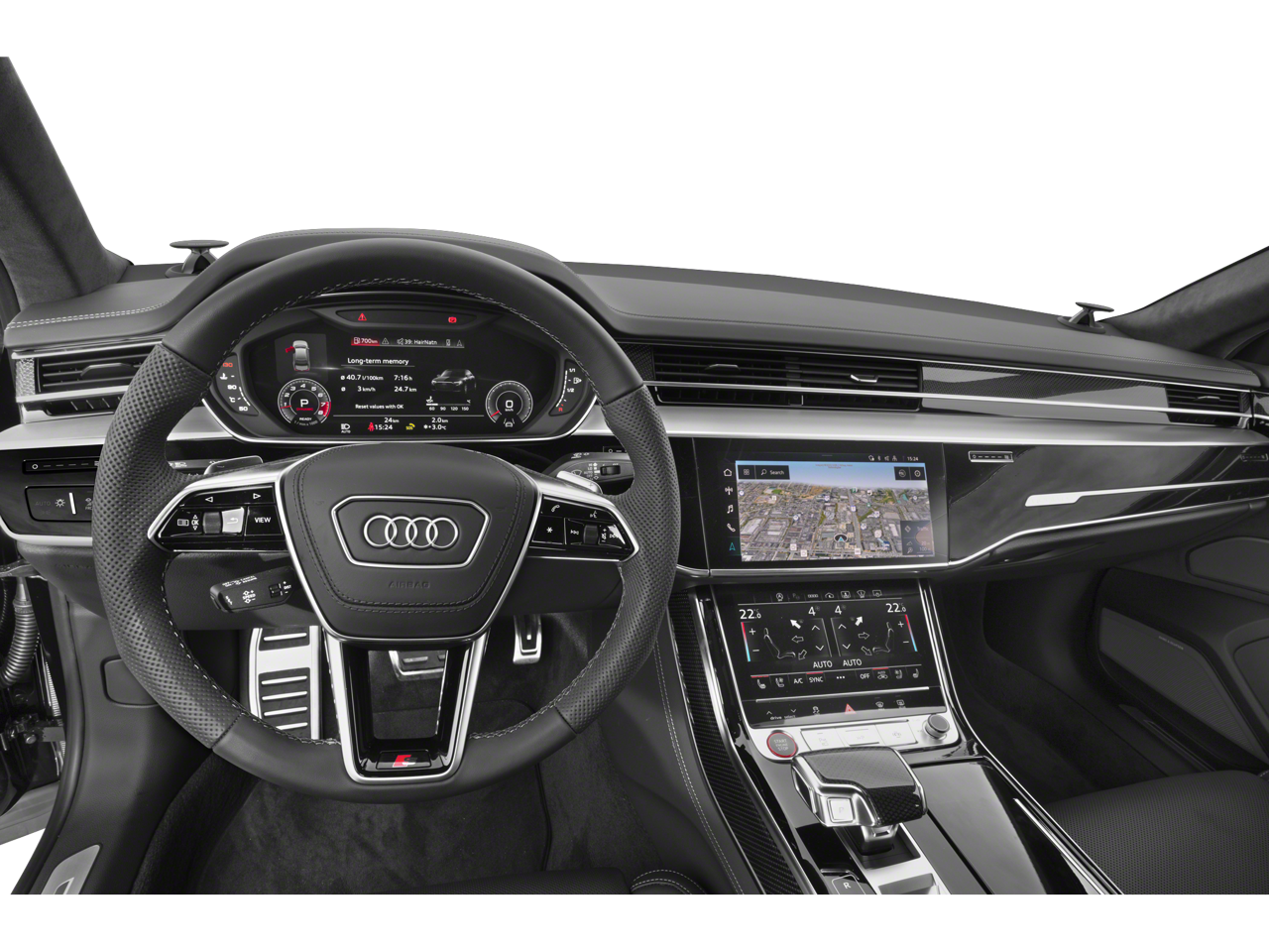 S8 Executive Package (Adaptive Cruise Assist w/Lane Guidance, Audi Side Assist w/Pre Sense Rear, Intersection Assist, Traffic Sign Recognition, and Wheels: 21 10-Spoke-Star Design), Adaptive suspension, Auto High-beam Headlights, Auto-leveling suspension, Bang & Olufsen Sound System w/3D Sound, Brake assist, Heated front seats, Heated steering wheel, Power 2nd-Row Moonroof, Power moonroof, Remote keyless entry, Ventilated front seats, 17 Speakers, 22-Way Power Front Comfort Sport Seats, 4-Wheel Disc Brakes, ABS brakes, Air Conditioning, Alloy wheels, AM/FM radio: SiriusXM, Audi smartphone interface (Apple CarPlay/Android Auto), Auto tilt-away steering wheel, Auto-dimming door mirrors, Auto-dimming Rear-View mirror, Automatic temperature control, Bumpers: body-color, Compass, Delay-off headlights, Door auto-latch, Driver door bin, Driver vanity mirror, Dual front impact airbags, Dual front side impact airbags, Electronic Stability Control, Emergency communication system: Audi connect CARE, PRIME & PLUS, Exterior Parking Camera Rear, Four wheel independent suspension, Front anti-roll bar, Front Bucket Seats, Front Center Armrest w/Storage, Front dual zone A/C, Front fog lights, Front reading lights, Garage door transmitter: HomeLink, Head restraints memory, Headlight cleaning, Heated door mirrors, HVAC memory, Illuminated entry, Knee airbag, Leather steering wheel, Low tire pressure warning, Memory seat, Navigation system: MMI Navigation plus, Occupant sensing airbag, Outside temperature display, Overhead airbag, Overhead console, Panic alarm, Passenger door bin, Passenger vanity mirror, Power adjustable front head restraints, Power door mirrors, Power driver seat, Power passenger seat, Power steering, Power windows, Radio data system, Radio: Audi MMI Nav Plus w/MMI Touch Response, Rain sensing wipers, Rear air conditioning, Rear anti-roll bar, Rear d